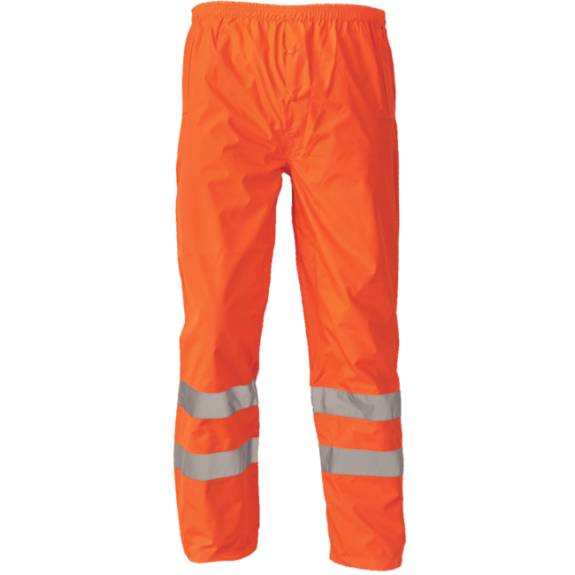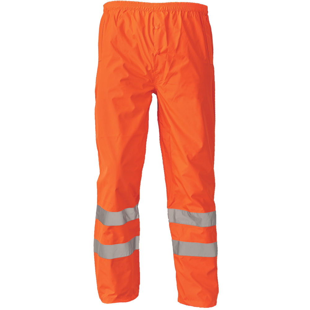 • Hi-Vis nepremokavé nohavice s reflexnými pruhmi • v páse na gumu • spodný lem nohavíc s reguláciou na plastové cvoky • podlepené švy