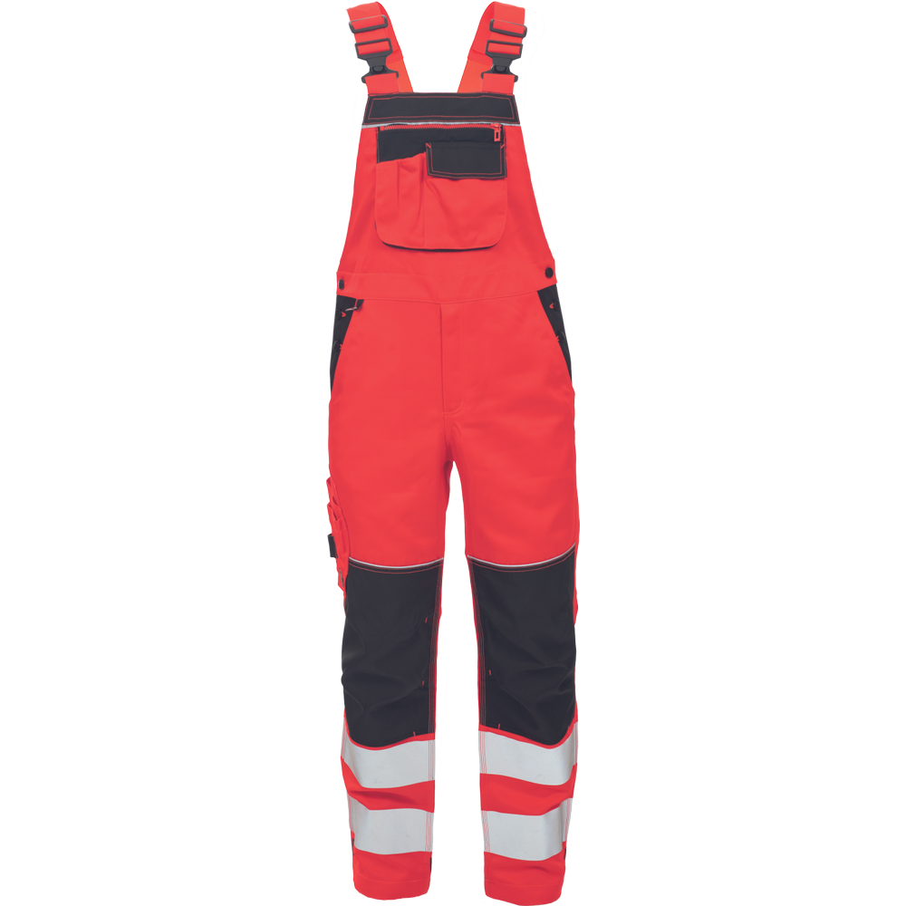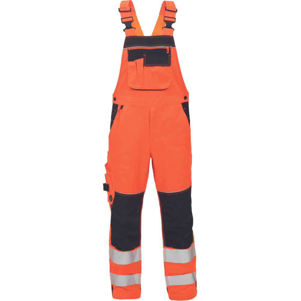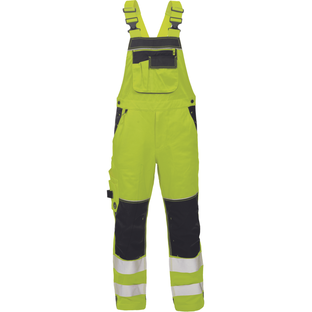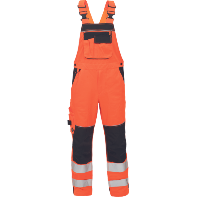 • pánske HI-VIS pracovné nohavice s trakmi • dvojica tlačených 7,5 cm reflexných pruhov • elastický pás • 6 funkčných vreciek • 600D Oxford zosilnenie v oblasti kolien s možnosťou vkladania kolenných výstuh • dekorativné prešitie v kontrastnej HI-VIS farbe • nastaviteľné dĺžka nohavíc